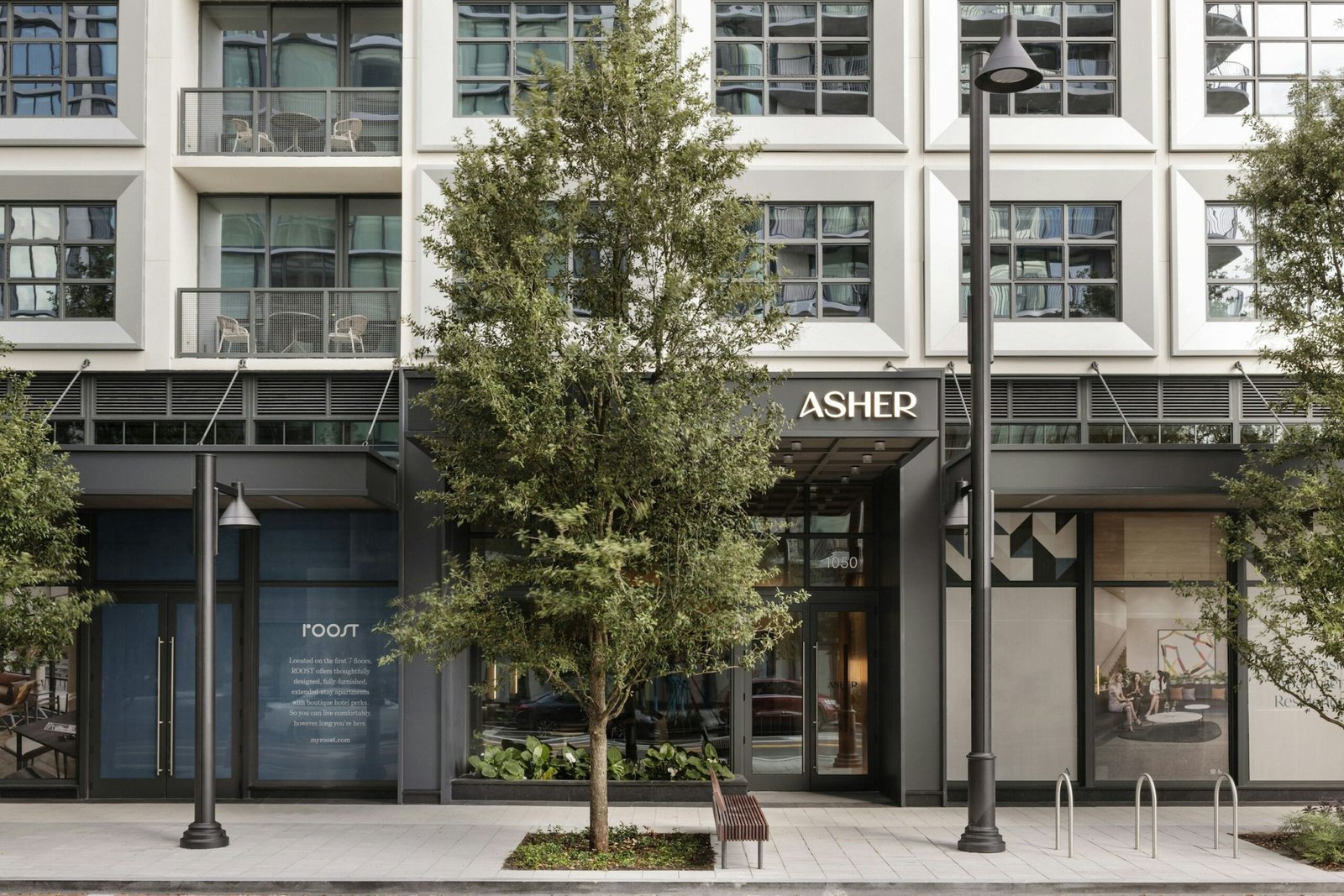 Asher also features a number of furnished apartments operated under the ROOST extended stay brand, including a number of unique co-living units that feature up to six lockable bedrooms, each with ensuite bathrooms, connected to communal kitchens and living spaces.